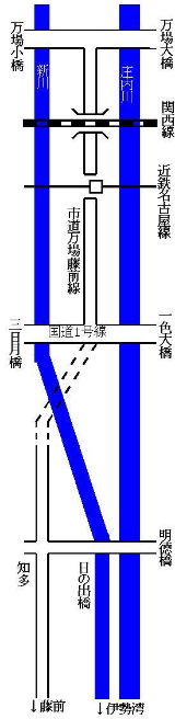 名前の示すとおり、名古屋市中村区の万場から名古屋市港区の藤前ー干潟で有名ーまでを南北に走る道路。殆ど出来ているが途中、近鉄名古屋線の線路と国道1号線の南の新川の前後で途切れている。 2008年08月15日。伏屋駅前を南から見る。街路樹の並びは線路を |