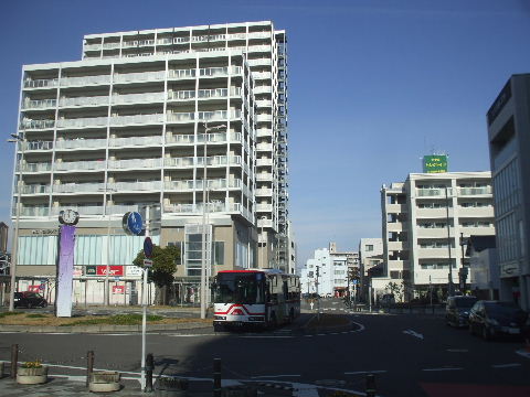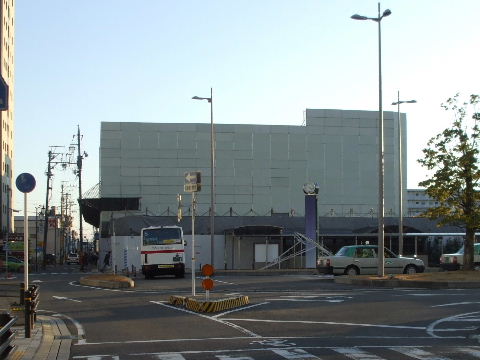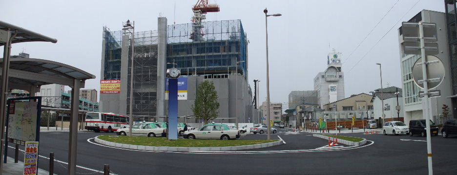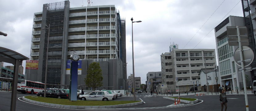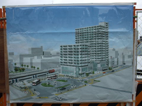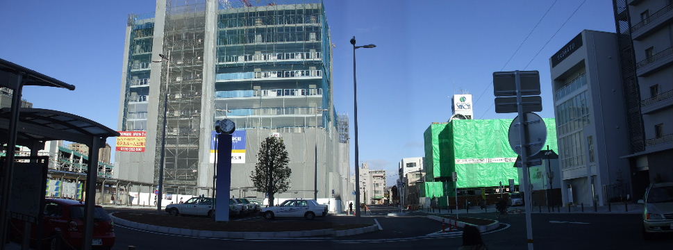 | 2008年11月3日。仮のバス乗場は無くなり新しい駅前の乗場へ向かうバスが見える。 | 2009年1月2日。ビルが高くなって左の民家の屋根越しにも見えるようになってきた。 |