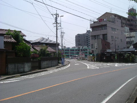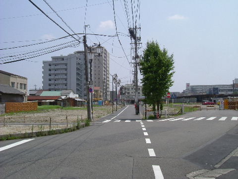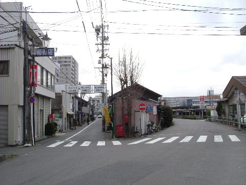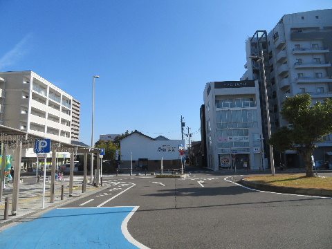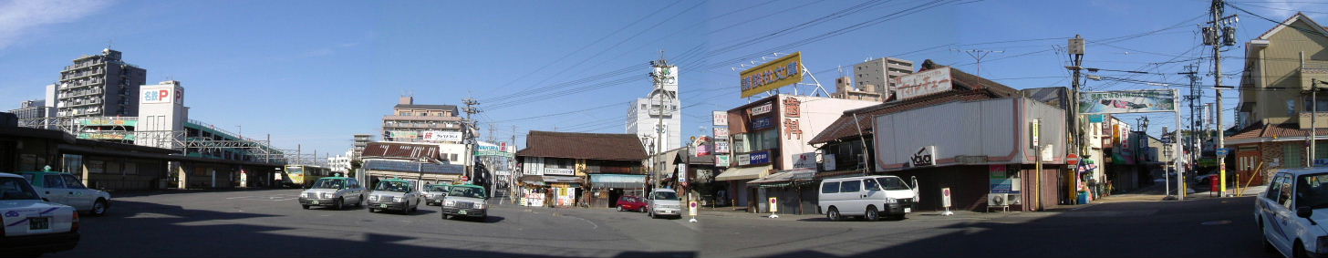 | 2007年1月20日。奥が駅前、右へ行くと駅北の踏切で一ノ宮方面へ向かう。 | 2007年7月28日。区画整理一番北側の建物が撤去された後が仮のバス乗場になっている。 |