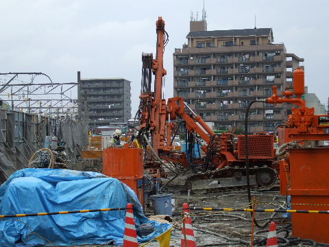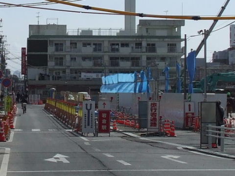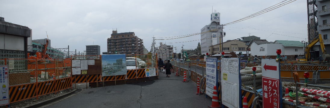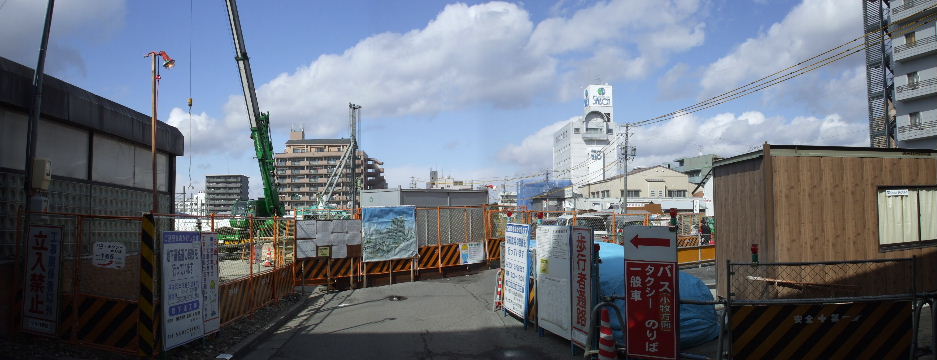 | 2007年11月10日。現在の駅も東西連絡地下道に駅施設があるが新しく地下道を作るようでその工事がかつてのバス乗場跡で行われている。 | 2008年2月23日。地面には既に鉄骨で支えられた地下道の穴が大分と掘られている。 |