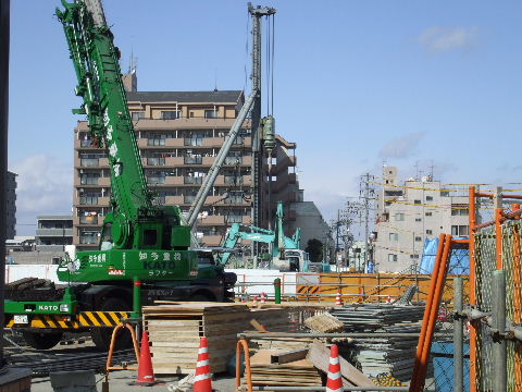 | 2008年2月23日。手前クレーンが地下道工事、奥が再開発ビルの基礎工事。プレハブの作業小屋のようなものが手前に出来て向うが見辛くなった。 |