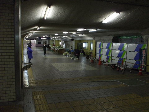 | 2008年2月23日。現在の地下道を東から見ている。奥、人のいる辺りの左側が改札口。手前右側に工事用のフェンスとシートで覆われている部分の向うから工事の音が聞こえてくる。工事中の地下通路はここへ繋がる事になるのか。通路では地元の農家の人が野菜等を並べて売っている。 | 200811月3日。左の写真では塀で囲ってある新しい地下出入口が出来ている。 |