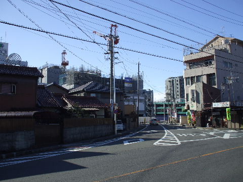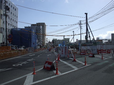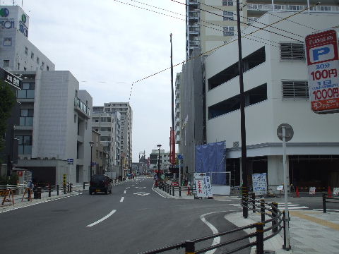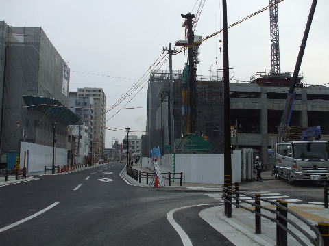 | 2009年4月21日。道路両側でビルが出来上がってきている。再開発ビルの1階には食品スーパーが入る模様。 |