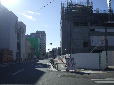 | 2009年1月2日。駅前ビルの工事が進み大分と高くなってきた。向かい側(右、東側)でも一棟新しく建設中。 |