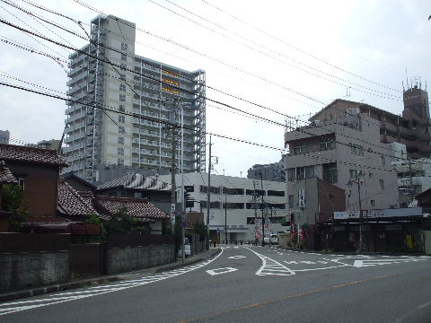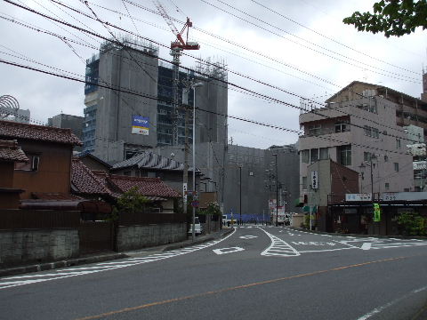 | 2009年4月21日。ビル建設が進んで道路の奥、向うが見通せなくなった。 | 2009年8月29日。ビル全体を見ることが出来る。 |