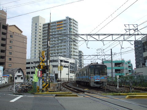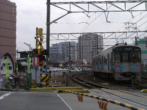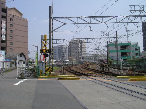 | 2007年1月20日。 停まっているのは引き上げ線の岩倉折り返しの電車。 | 2007年7月28日。踏切の奥、以前は駐車場だった辺りが仮のバス乗場になり、民家がなくなっているのが判る。 |