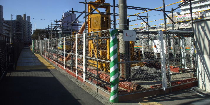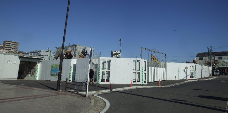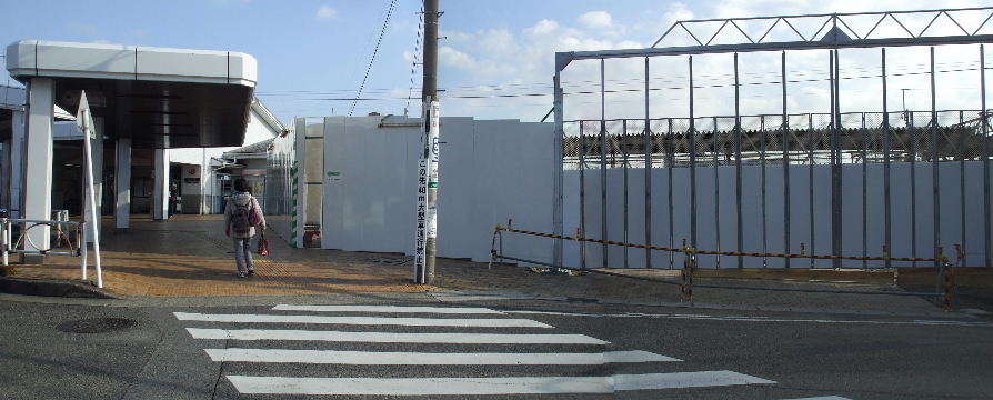 2013年1月19日。仮駅仮跨線橋現場が塀で囲われる。 |