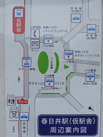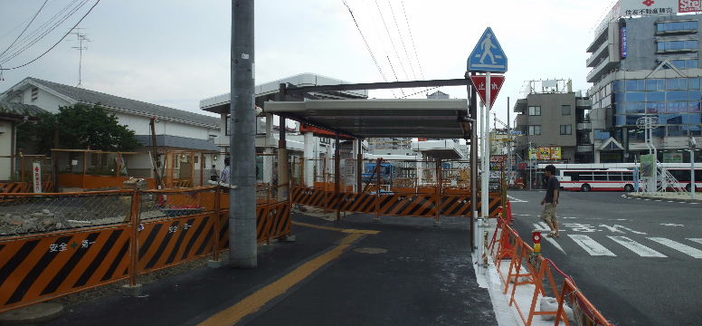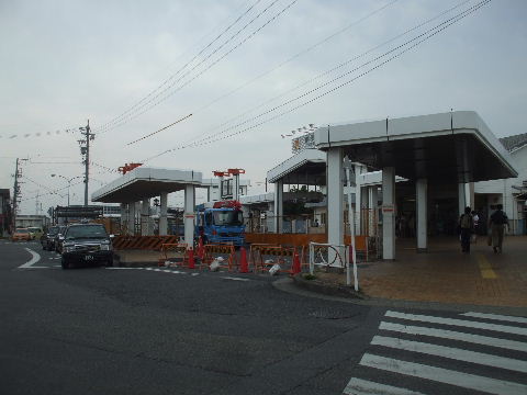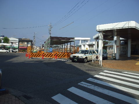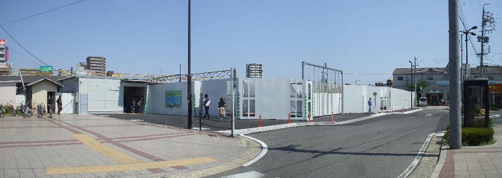 2013年5月5日。南口。元駅舎のあった所は塀で囲まれ、便所の横に仮駅舎できる。道路沿いの歩道を少し削って送迎用スペースとバス停設置。 |