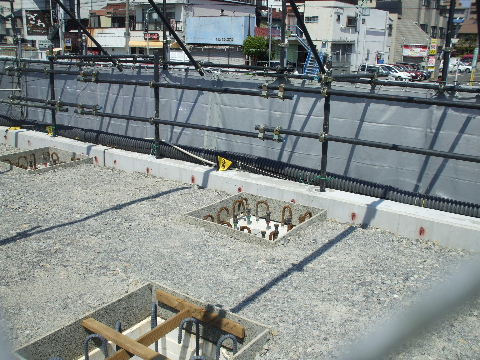 2013年6月16日。跨線橋脇で仮駅舎基礎工事。 |