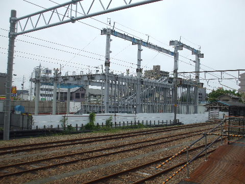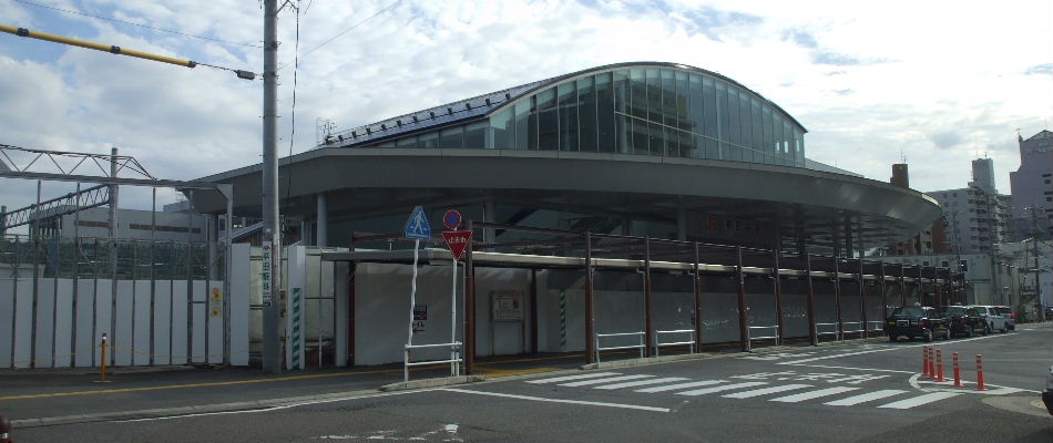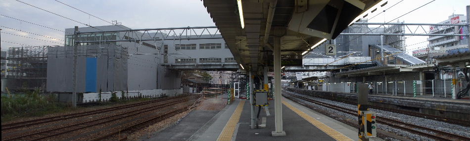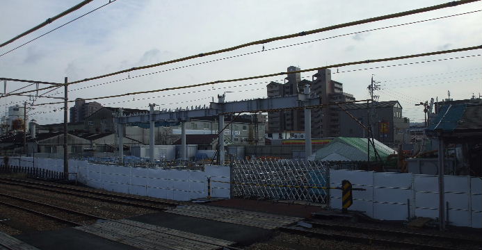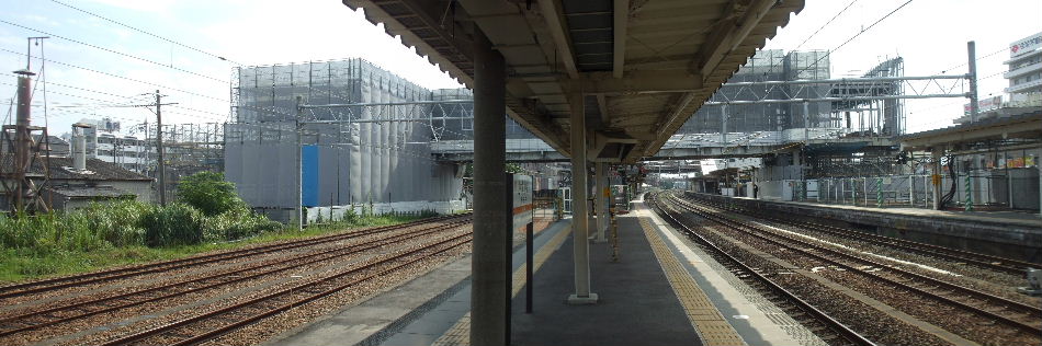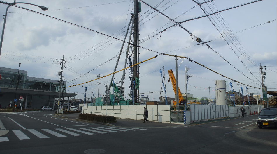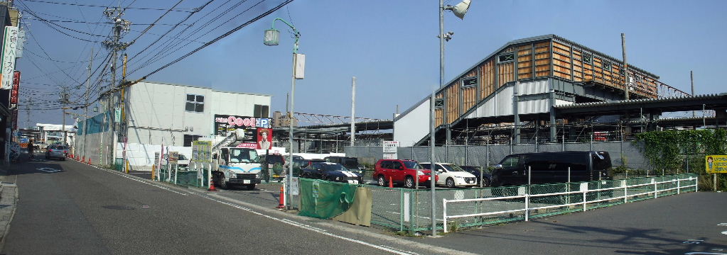 2013年11月23日。ホーム神領方から見る。ホーム先の柵で囲った所で橋上駅舎の基礎工事が行われている。立っている架線柱の手前辺りに橋上駅舎がのっかる。 |