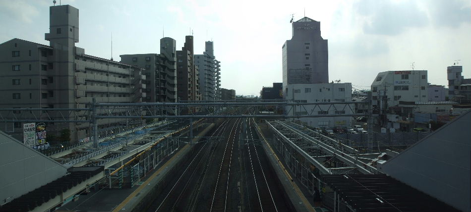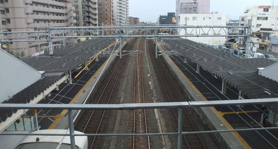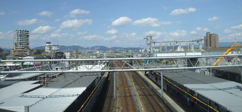 2017年05月15日。橋上駅舎から仮跨線橋の無くなった名古屋方向を見る。撤去跡のホーム屋根がまだ鉄骨だけ。 |