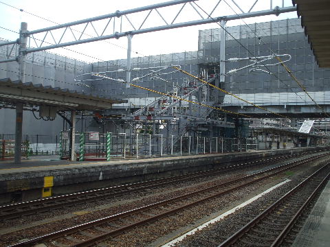 2016年12月18日。貨物の入れ替え線の架線柱が新しいのに取り換え中。手前のはホームに架線柱が立ち、ひとつ奥のはホーム側は新しい駅舎の壁に取り付けられている。 |