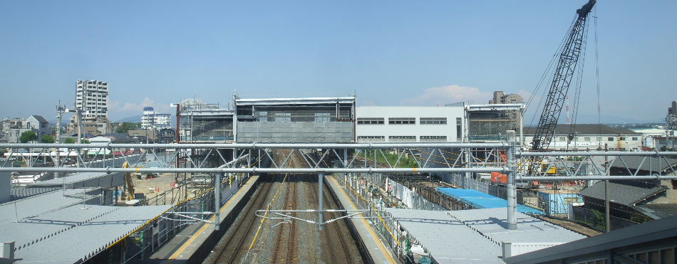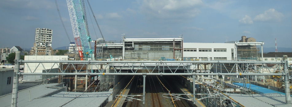 2017年05月15日。仮跨線橋撤去されホーム屋根工事中。 |
