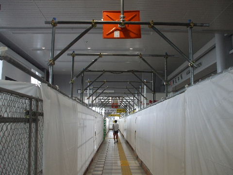 2013年9月7日。塀が無くなって仮駅舎が見えるようになった。改札内トイレの背中、キヨスクの前を通っ |