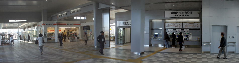 2016年10月30日。駅施設部分。左から売店、改札口、切符売り場、特急券とか用の券売機、普通の券売機。券売機は4つ枠があるが1つは空きになっている。今日は見物人が多い。 |