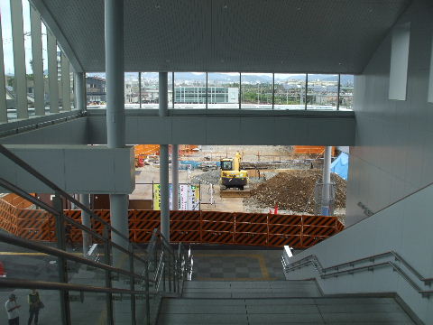 2016年08月21日。仮の跨線橋に使っている橋上駅舎通路から覗けるようになった。通路から駅入口部分。 |