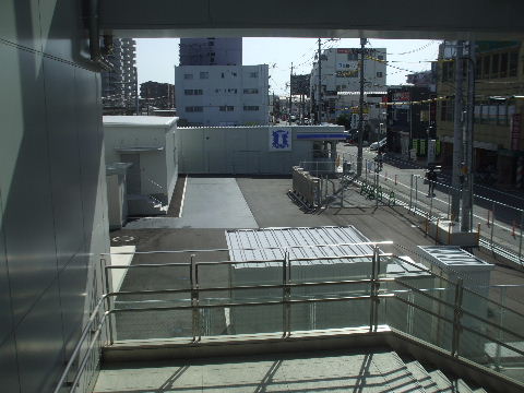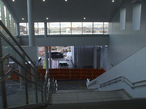 2018年03月03日。北口東向き階段から東を見る。奥に以前からある待車場と駐輪場へ向けてまた、左方向へも車道を跨いで屋根を作っている。右は店が出来るか? |