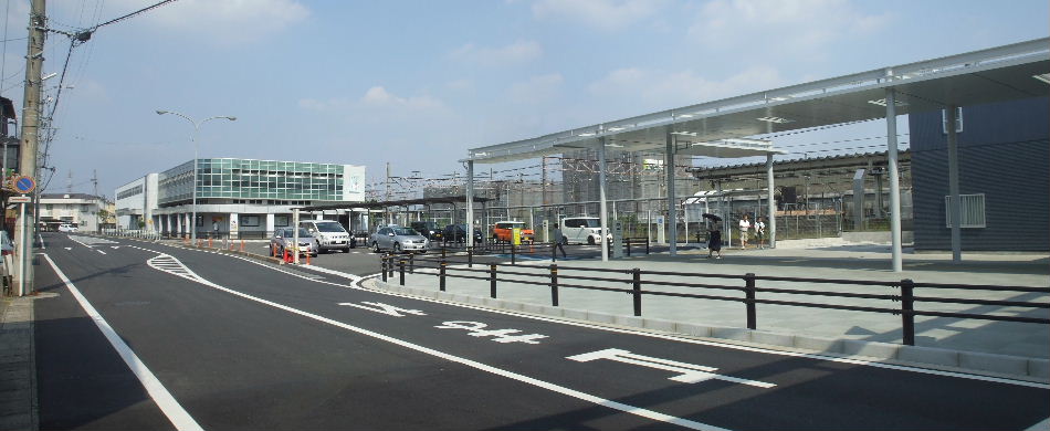 2018年05月14日。北口東側の待車スペースも出来、屋根が奥の駐輪場までつながっている。街灯が一見傾いているように見えるが実は傾いている。車にぶつけられたようだ。 |