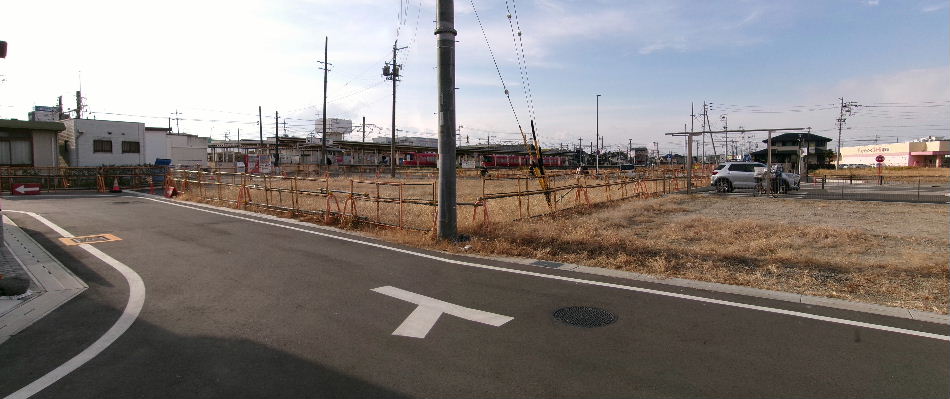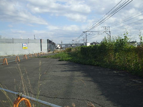 | 2021年02月28日。新幹線の南。ここで地平に下りてくる。 | 2022年10月30日。線路東側の道路沿い。ぼちぼち空き地に なってきていて 看板が立つ。 |