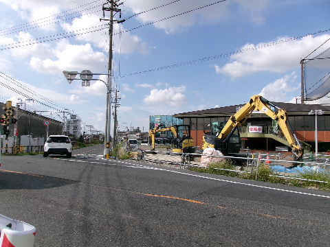 | 2025年09月28日。駐車場を潰して仮道用地作り中。 ついでに踏切道も拡幅工事中。 |