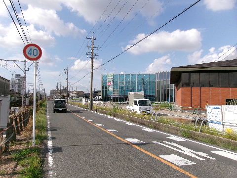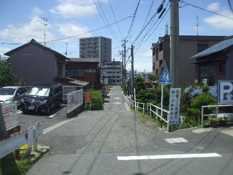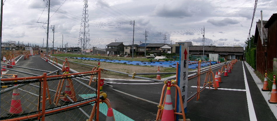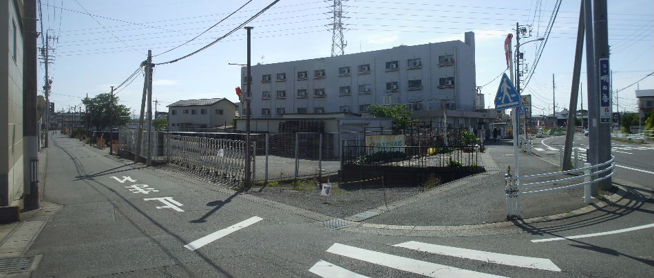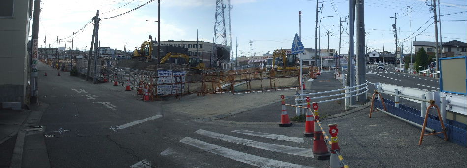 2024年06月22日。名二環手前から新清洲駅方向。 建物は既に無くなり跡で側溝工事中。 |
