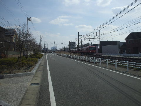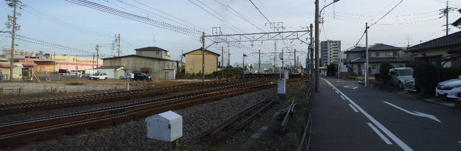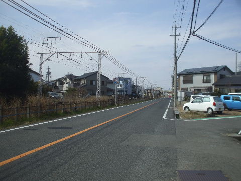 | 2021年02月28日。名二環のすぐ南から駅方向を見る。 建ててまだそんなに年数の経ってなさそうな家が並ぶ。 |