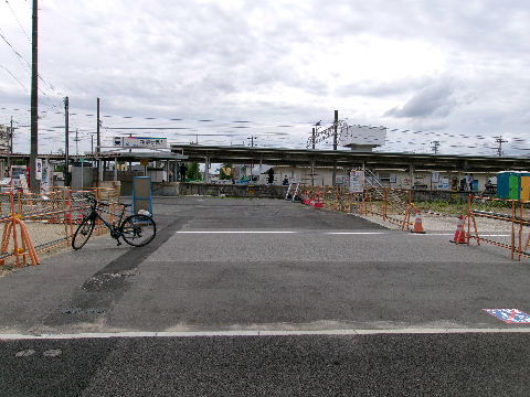 | 2022年10月30日。駅前広場は画像左の現駅とは少し離れていて仮駅を作るスペースをを空けてあるのが判る。高架駅が出来て仮駅が撤去されたら駅前広場は高架駅すぐの仮駅跡に作り直されるか。 | |