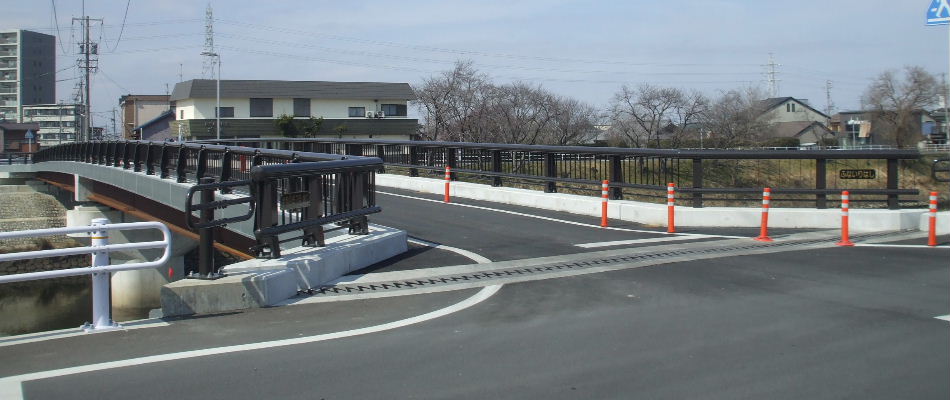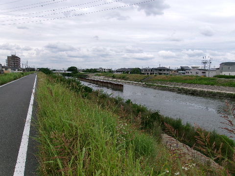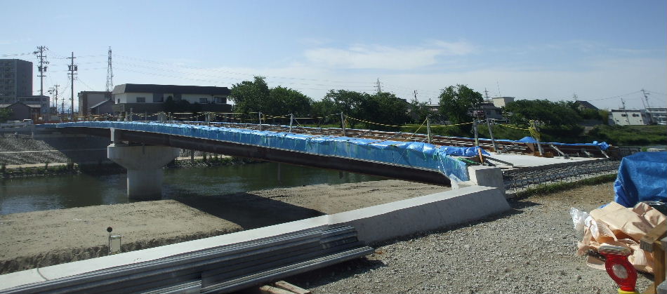 | 2017年11月17日。直進で向こう側の堤防道路につながるので新しい橋に替わればここも上下と同じ川幅になる。橋は2倍くらいの長さになる。 | |