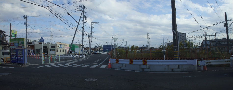 2022年10月30日。名二環の手前から駅方向を見る。 立ち退きが進んで仮道用地が確保されつつある。 |