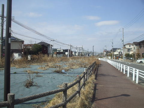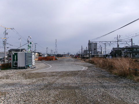 | 2021年02月28日。ここは既に仮線を敷ける用地が 確保されている。左は産業廃棄物処理作業場で 騒音防止の高い塀が立つ。 |