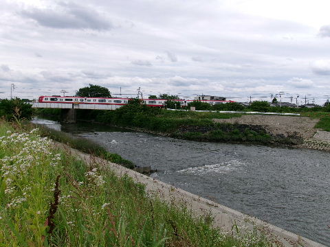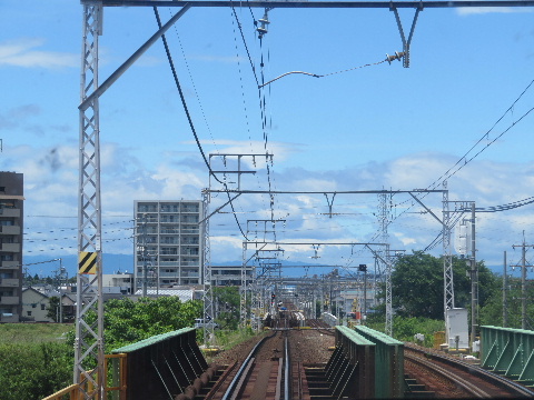 | 2017年11月17日。地平の丸の内駅を出るとすぐ上り坂になる。 | 2019年06月08日。車内から見る。美濃街道を跨ぐ鉄橋を 渡り少し下るとすぐ五条川の鉄橋。 |
