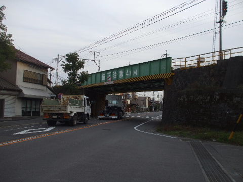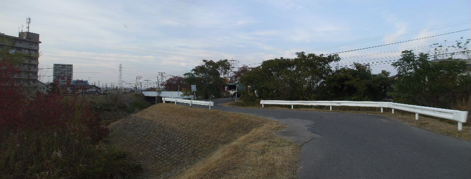 | 2017年11月17日。今はここで既に坂は終わっているが 右へ100mほどの五条川堤防道路の踏切を高架化する にはさらに上らなければならないのでこの鉄橋も作り変 えられそうだ。 |