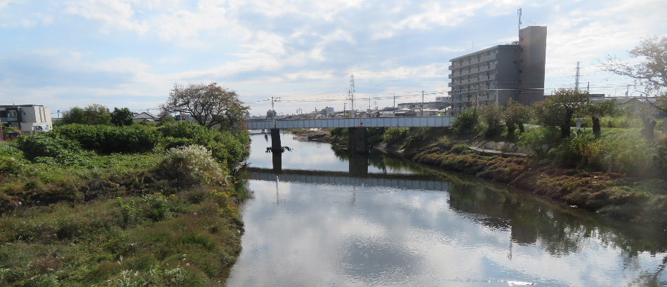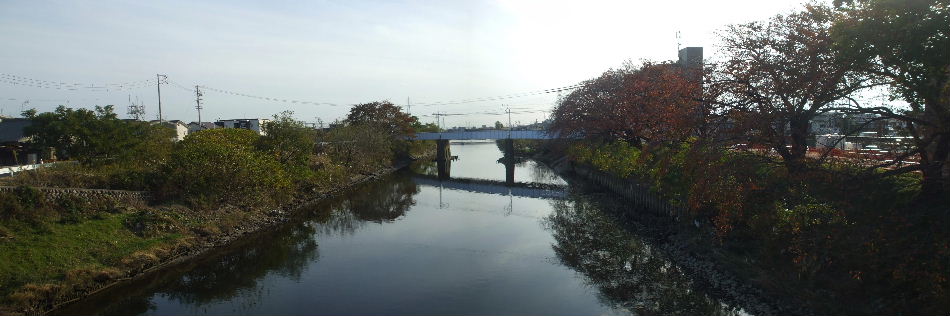 | 2017年11月17日。鉄橋が架かっているのは水の流れているところだけで左岸の河川敷水際に左岸堤防道路が折れ曲がっていてここだけ川幅が狭くなっている。普段はいいが大雨で増水するとここがボトルネックになって水が両岸に溢れるようなことになる。 | |
