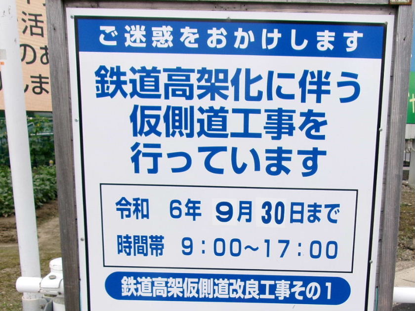 2025年09月28日。この先100mくらいの間で こんなことが行われている。仮道部が済んだら 道路を仮道に移して今の道路部、それが済んだ ら今の道路部に仮線を敷いて今の線路部と順繰 りにやるのか。表示してある期間がトータルの ものか1ヶ所ずつのものか。 |