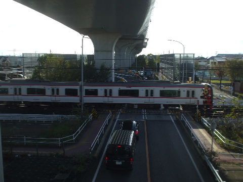 | 2017年11月17日。高架化を予定して高いところを跨ぐ名二環。 | 2017年11月17日。架線の高さの倍くらいある。一般道は 今のところ二車線のみで高速の橋脚のどちらかを通って いて場所により左右移動している。 |