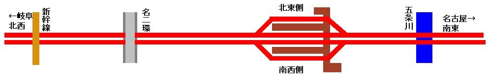 | 五条川手前から新幹線手前くらいまで高架化される。仮線仮駅は北東側に作られる。 | |