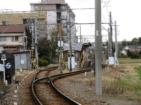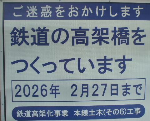 | 2025年02月16日。駅前から。駅舎の向こうに ちょっと高架橋っぽくなってきたのが見える。 |