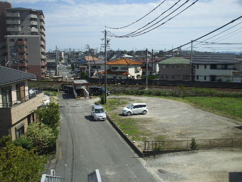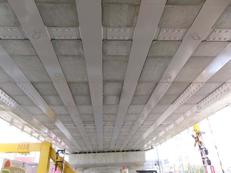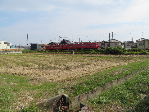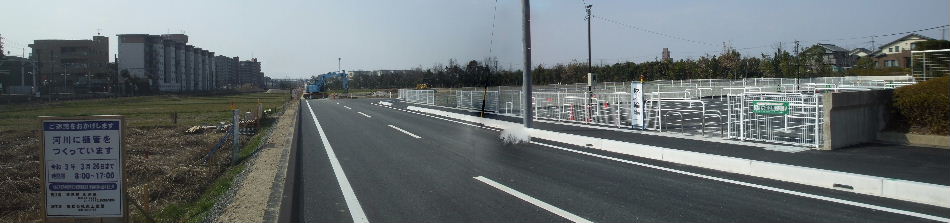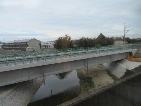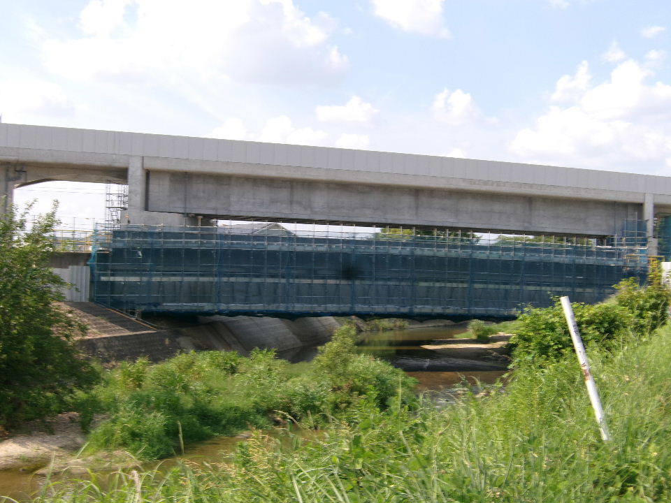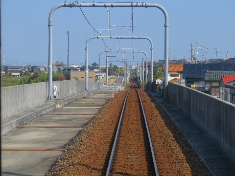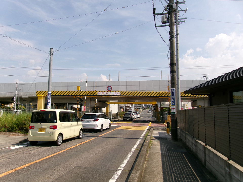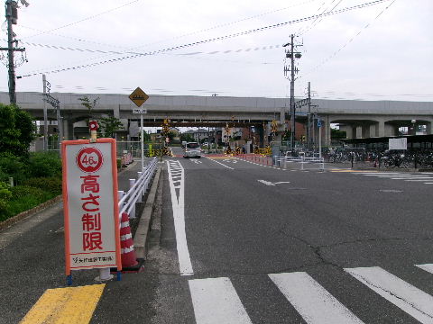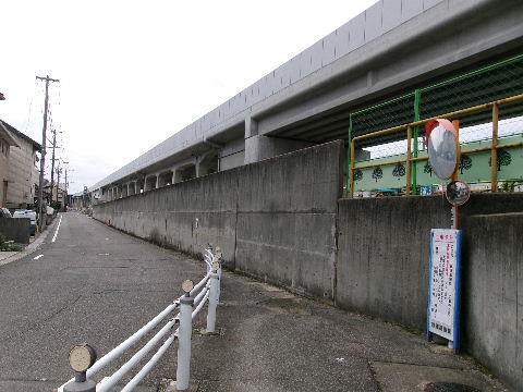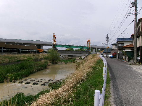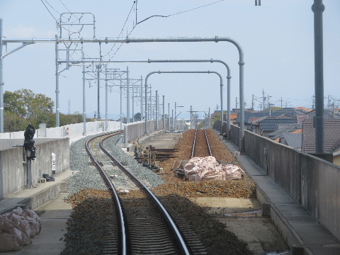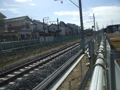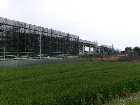 2025年04月20日。竹村方向。ここは高架橋が 地平に下り始めて低くなっているので橋を 架けると同時に保護バーも設置。 |