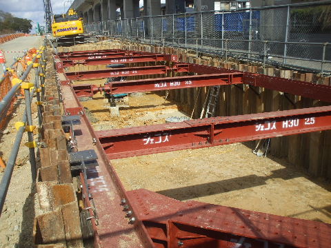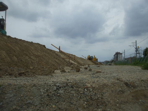 | 2022年09月04日。地平に下りてくる土盛り部に土が入り 矢板で土留め。 |