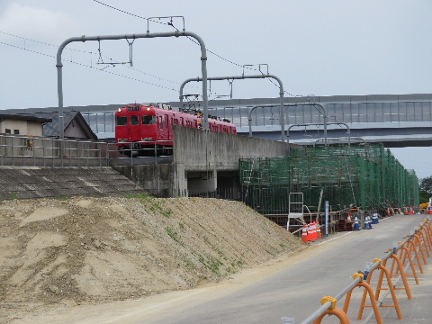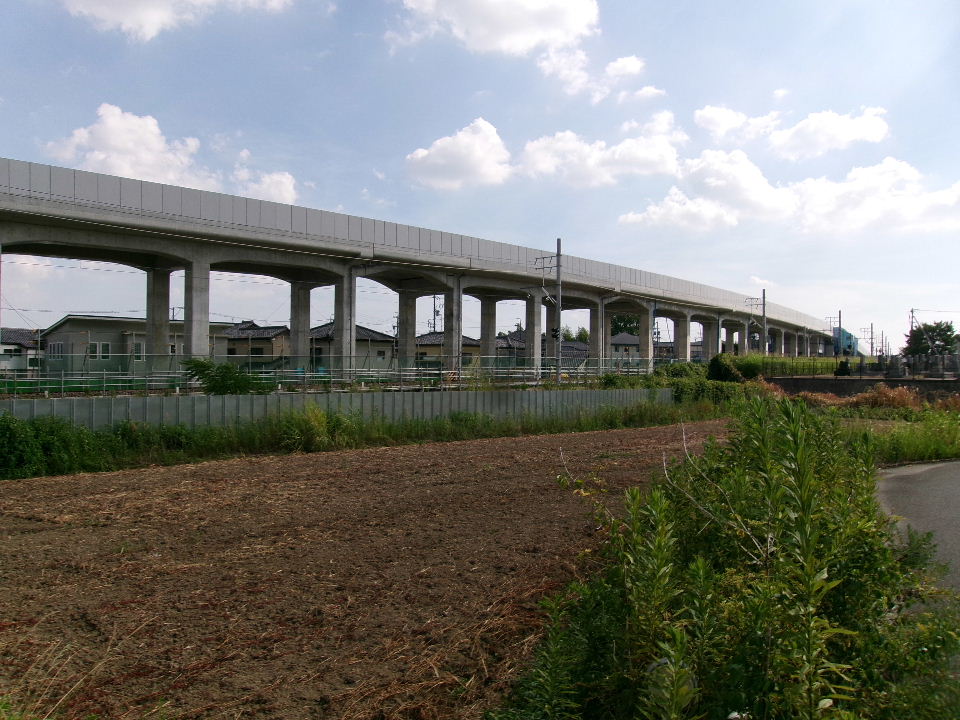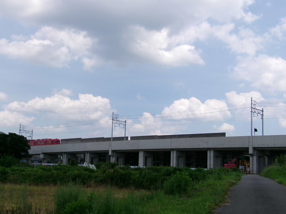 | 2025年08月17日。北から。出来ている。 | 2025年08月17日。竹村方向。この先、地平に下りる 土盛り箇所手前まで高架橋が出来ている。 |