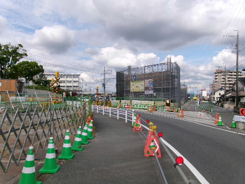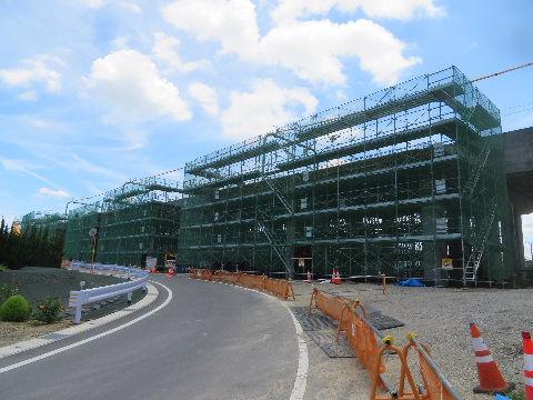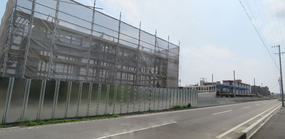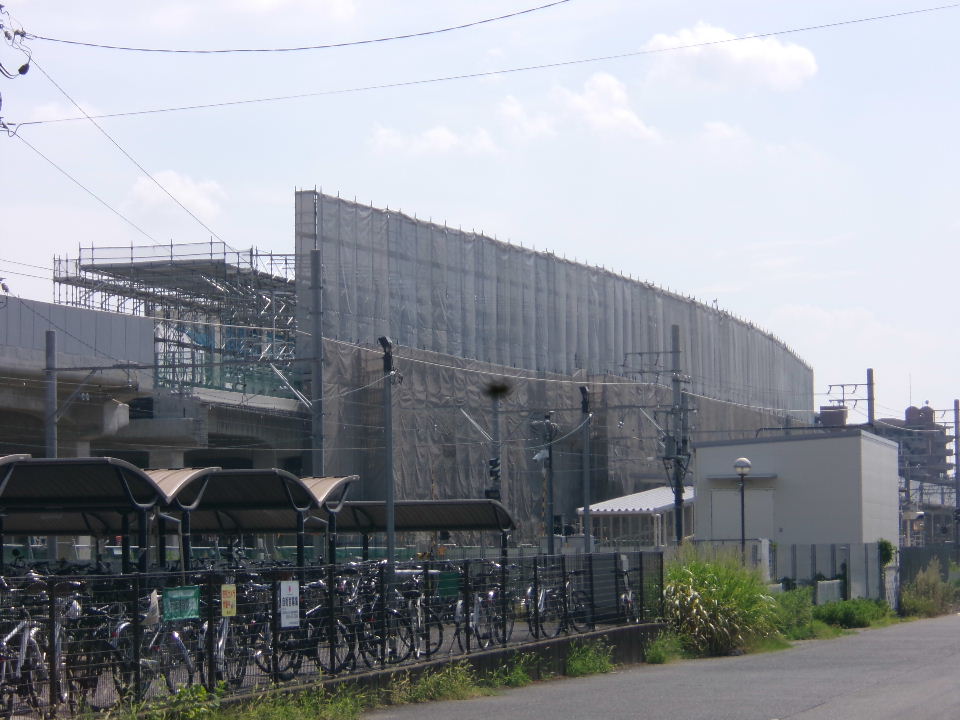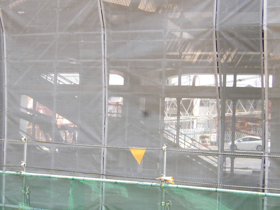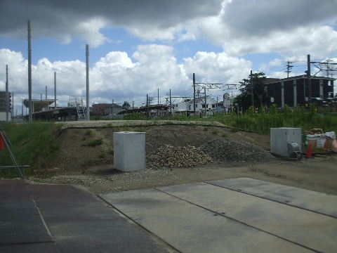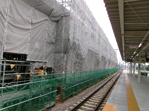 | 2025年08月17日。駅前広場から見る。 | 2025年08月17日。反対側は仮線に物を落とらかす といかんので高いシートで囲われている。 |