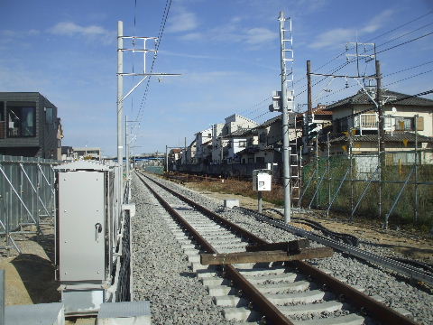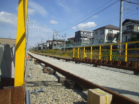| 2022年09月04日。踏切脇から若林方向。架線柱。 | 2022年10月23日。枕木に載ったレールが置かれている。 |
