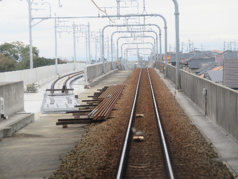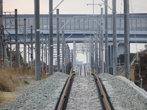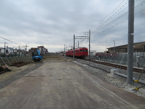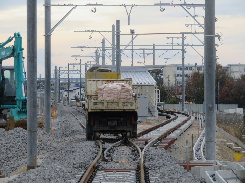 | 2025年11月30日。右、三河八橋方から架線柱を立て始めている。4本立って5本目に掛かっているところ。 | |