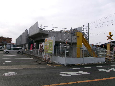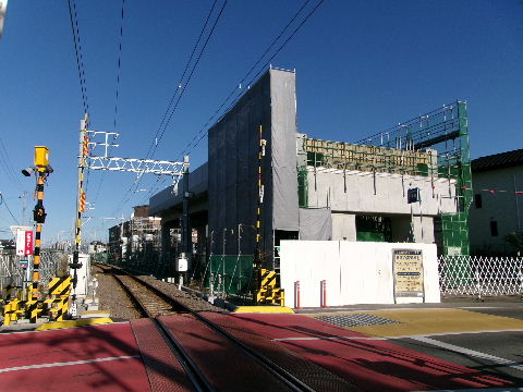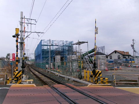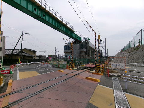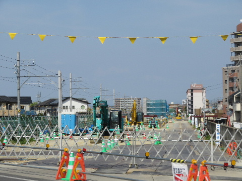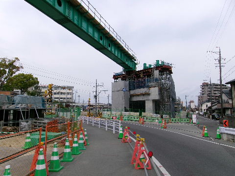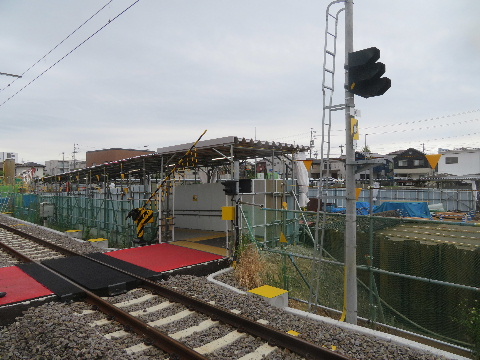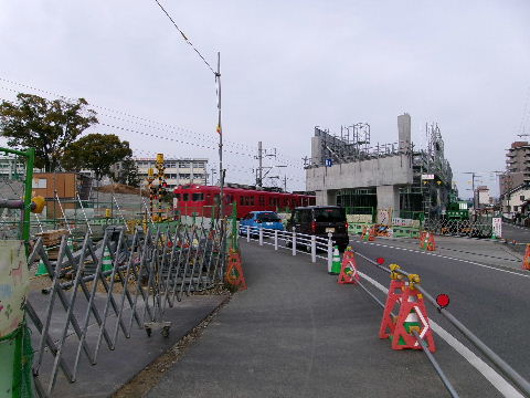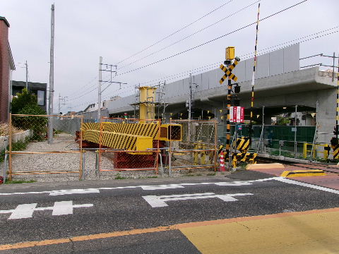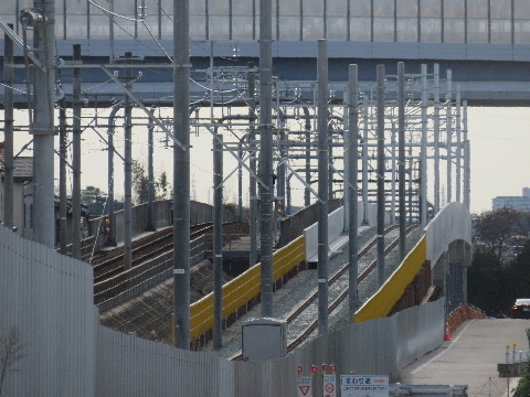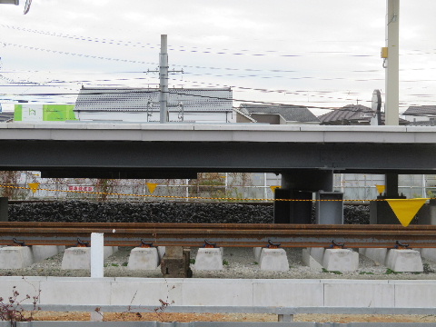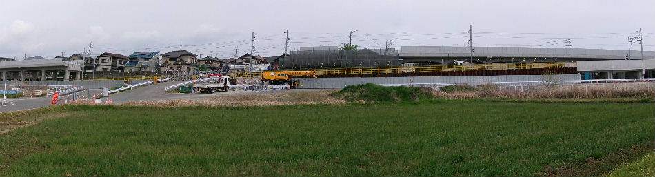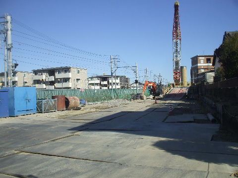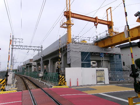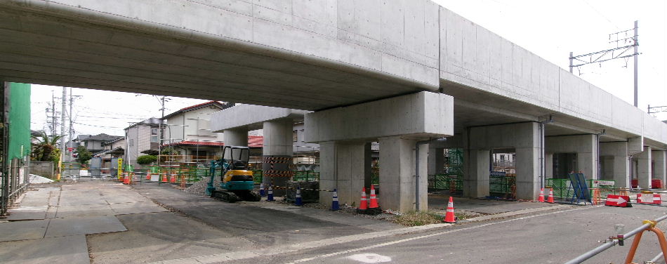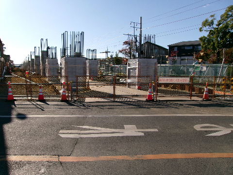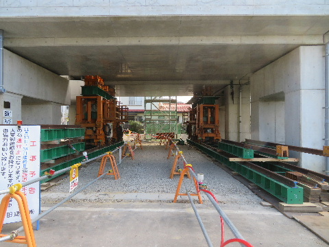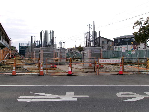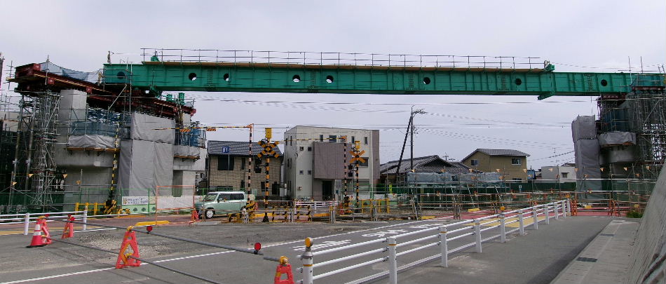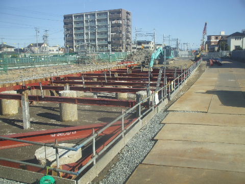 | 2024年11月24日。若林方向。こちらも同様。 | 2025年02月16日。駅方向の高架橋が出来、 踏切上に橋を架ける準備。 |