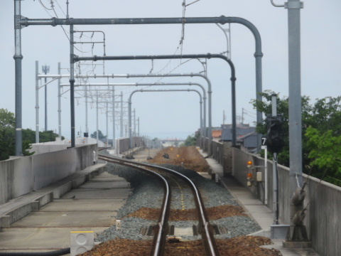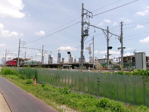 | 2022年07月24日。踏切脇から駅方向。仮駅三河八橋方端まで架線柱が並ぶ。 | |
