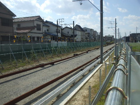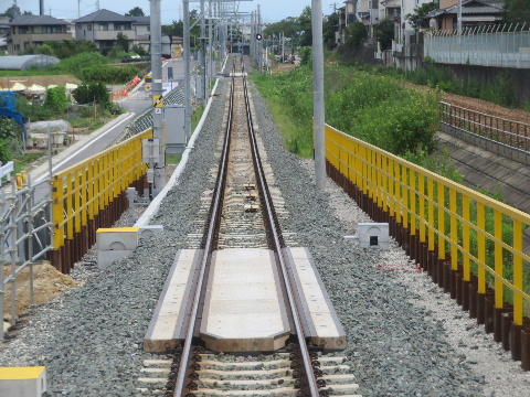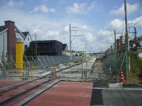 | 2022年10月23日。若林駅方向。レール準備。 | 2022年10月23日。竹村駅方向、工事終わり部。こちらも同様。 |