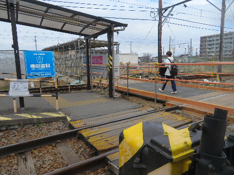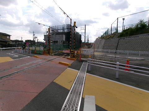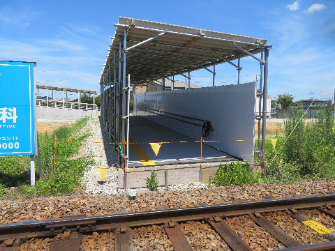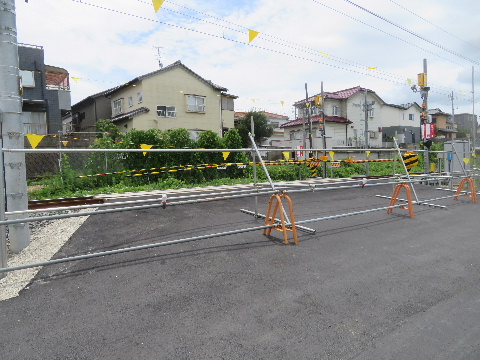| 2023年07月15日。線路部には簡単な踏切警報機も ついていて作業用の出入口になる。線路反対側は 住宅が並んでいて出入口を作れるところがないので 仮線を渡る形でしか作れない。 |