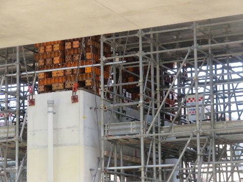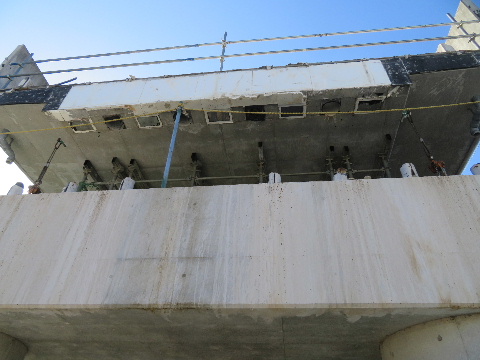 | 2023年12月10日。ジャッキで持ち上げられて橋台から 浮き上がった桁。この橋台と桁の間にブロックみたい のを挟み込むのか。 |