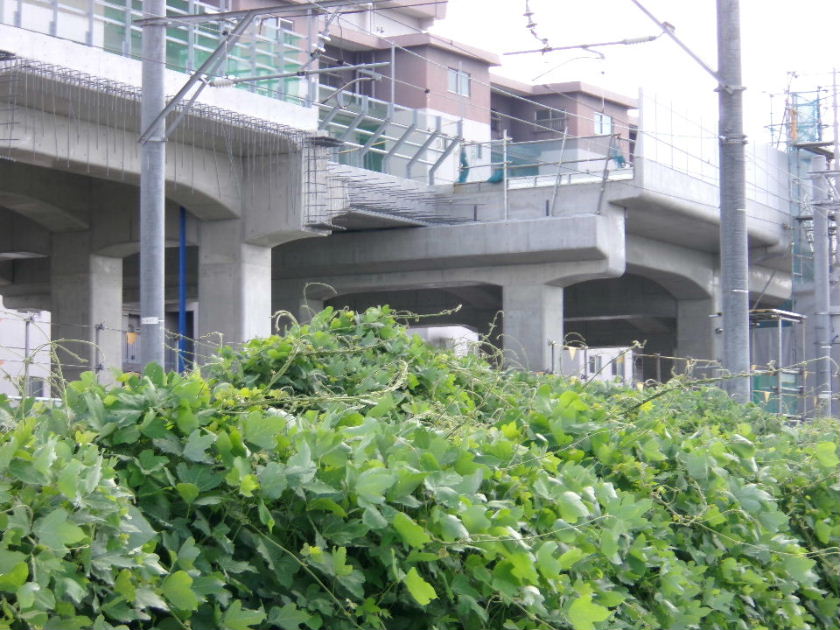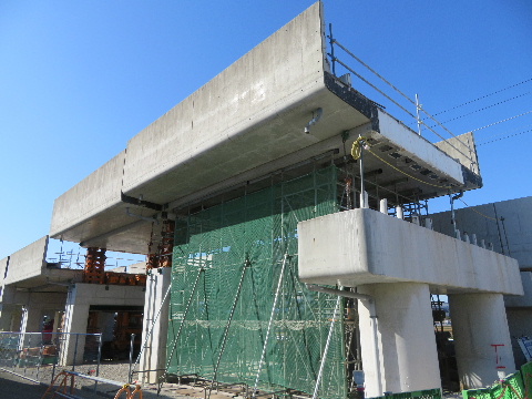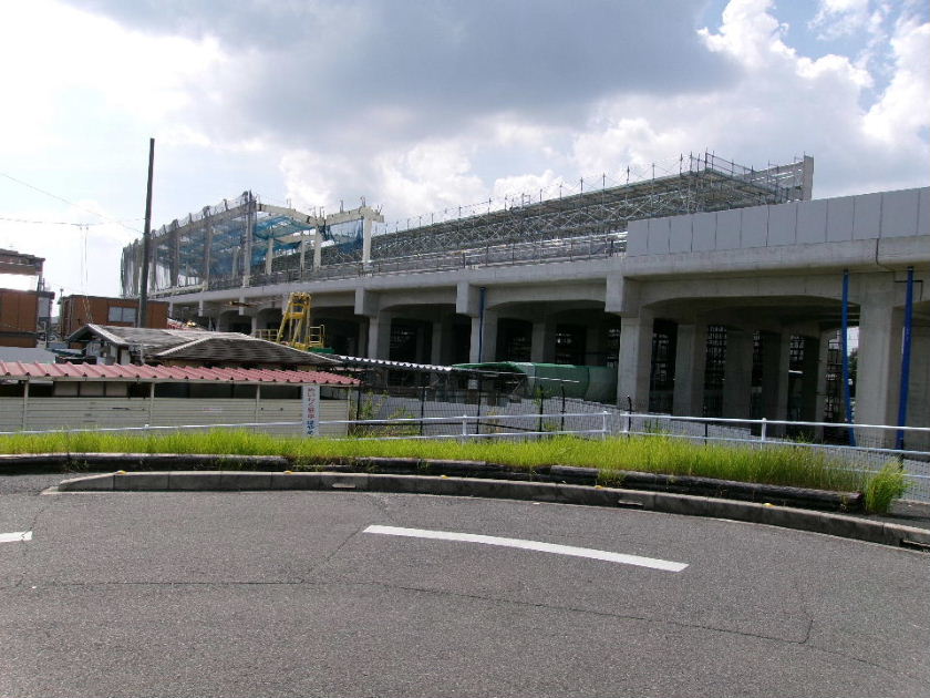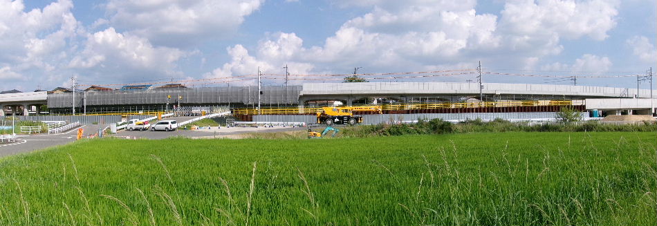| 2025年08月17日。竹村方の下り副本線高架橋。 | 2025年10月12日。駅前から。ホーム屋根の鉄骨 組みが進む。 |