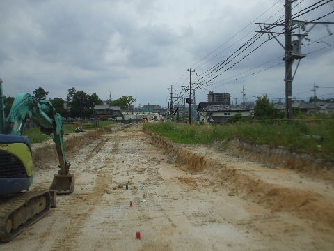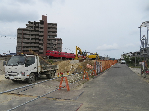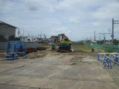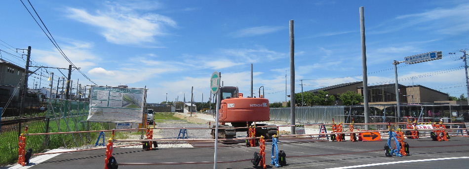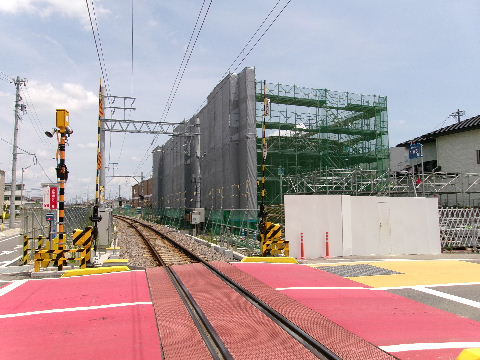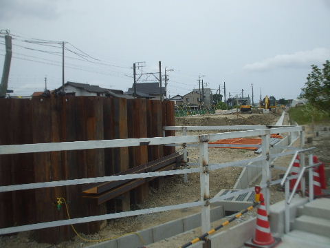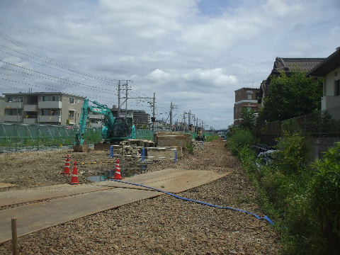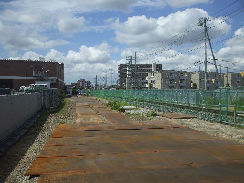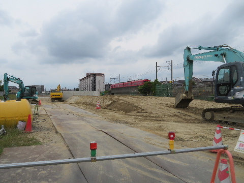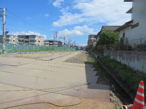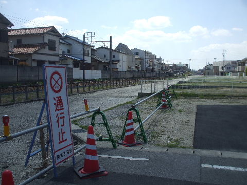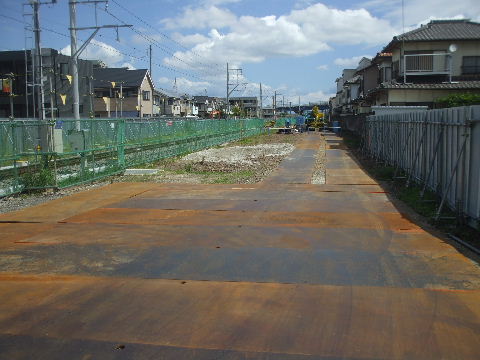 | 2023年05月05日。竹村方向。こちらも同様。 | 2023年07月15日。駅方向。鉄板敷かれ重機入る。 |